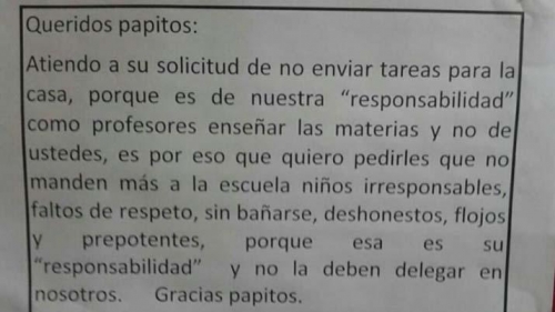 Atiendo a su solicitud de no enviar tareas para la casa, porque es de nuestra "responsabilidad" como profesores enseñar las materias y no de ustedes, es por eso que quiero pedirles que no manden más a la escuela niños irresponsables, faltos de respeto, sin bañarse, deshonestos, flojos y prepotentes, porque esa es su "responsabilidad" y no la deben delegar en nosotros. Gracias papitos".