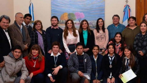 La gobernadora de la Provincia, Claudia de Zamora, recibió en el Salón de Acuerdos del Ejecutivo provincia a alumnos de las cuatro escuelas que representaron a Santiago del Estero en la 3ª Feria Internacional de Emprededorismo Escolar 2016, realizado en el Ministerio de Educación de la Nación, en Buenos Aires.