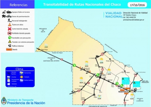 Respecto al estado de las rutas nacionales, desde Vialidad detallan que en la ruta N° 11 se debe tener precaución en la zona urbana de Resistencia km. 1002 al 1004 (entre Av. Malvinas y Av. Alvear), y 1005, por la obra de la autovía 11. En la ruta N° 16 piden precaución en autovía Avellaneda en el km. 8,5 y 15, dirección Sáenz Peña, por trabajos de reparación de losas de hormigón. Entre los km. 26,5 al 30 habilitado desvío. Se transita en doble mano por una calzada por la construcción de alcantarillas. Entre el Peaje de Makallé y el acceso a Lapachito – La Verde, trabajos de repavimentación y entre Sáenz Peña y el límite con la Provincia de Santiago del Estero por trabajos de ensanche y repavimentación en diferentes sectores de ese tramo.