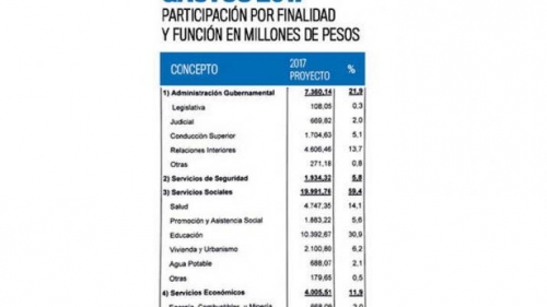 Según el informe que acompaña el proyecto de ley del Presupuesto 2017, con relación a los gastos según finalidad y función, hay una importante asignación para la construcción de obras de vivienda y urbanismo ($2.100,8 millones).