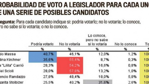Esto, trasladado a la intención de voto para legislador para hipotéticas candidaturas, refleja que el 40,7% del mayor electorado del país se pronunciaría a favor de Sergio Massa; seguido por Cristina Kirchner (35,6%), y de Elisa Carrió (28,3%). Más abajo en la preferencia de la gente, figuran Daniel Scioli (28%), Florencio Randazzo (27,8%); Margarita Stolbizer (25,5%), y aún más retrasado, Jorge Macri (13,8%), el primo del presidente y que sería el que recoge mayores adhesiones en la mesa chica de Cambiemos.