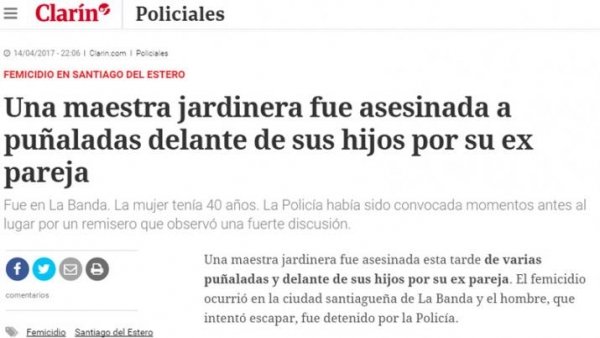 “Una maestra jardinera fue asesinada a puñaladas delante de sus hijos por su ex pareja”, así titula Clarín el hecho de sangre que caló hondo en Santiago del Estero.