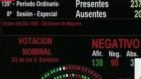 Tiempo de lectura: 2 minutos, 36 segundosLa votación culminó por 138 votos afirmativos y 95 negativos, sin poder llegar a los dos tercios marcados en la Constitución Nacional.