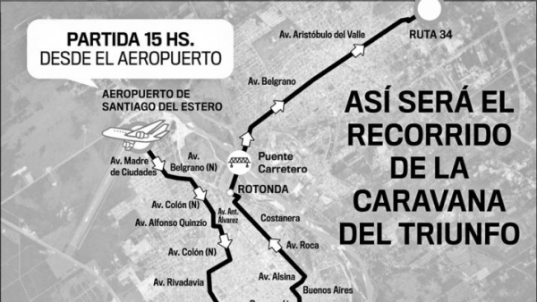 En su amplio recorrido, la “Caravana del Triunfo” durará cerca de cuatro horas desde su partida del Aeropuerto hasta inmediaciones de la ruta nacional Nº 34.