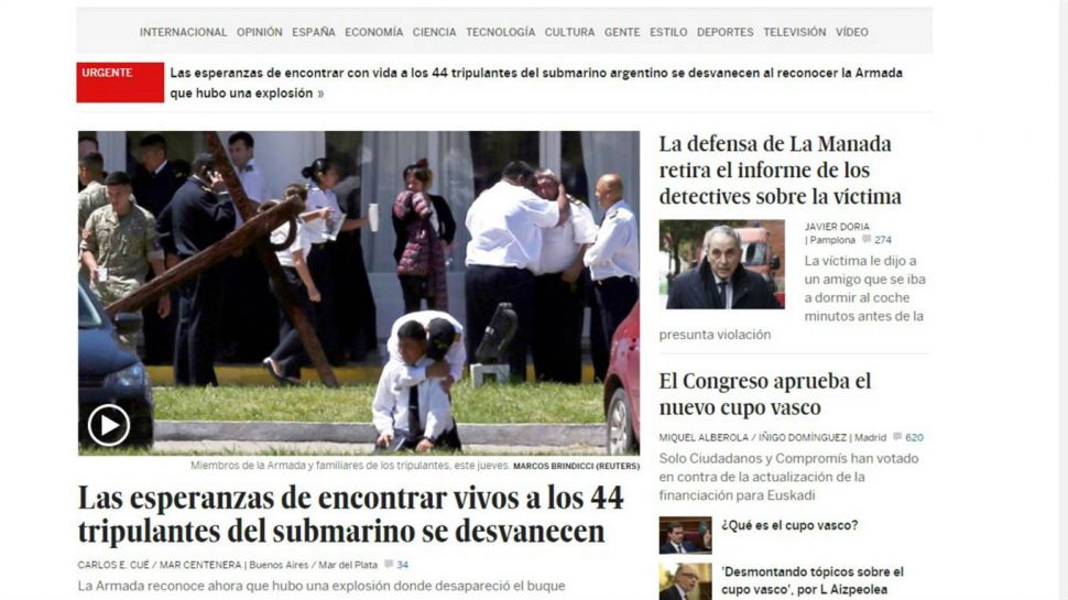 "El pesimismo ya se había extendido por el paso del tiempo, pero ahora además hay una información definitiva que difumina toda esperanza de encontrar con vida a los 44 tripulantes del ARA San Juan", informó el diario español.