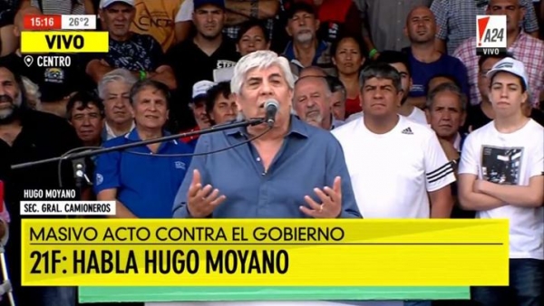 En una masiva marcha, el secretario general del gremio de Camioneros, Hugo Moyano, brindó un encendido discurso en el que cuestionó al Gobierno y aseveró que no tiene “miedo de ir preso” ni de que lo “maten”, porque está “dispuesto a dar la vida por los trabajadores”.