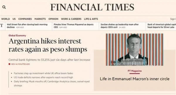 Tiempo de lectura: 1 minuto, 37 segundosBajo el título "Argentina vuelve a subir las tasas de interés a medida que se desploma el peso" como primer noticia en su portal el periódico económico británico habla sobre la devaluación del peso y las medidas que toma el Banco Central que parecen no aminorar la corrida.