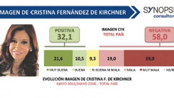 El sondeo realizado a nivel nacional, entre el 11 y el 12 del corriente mes, sobre 1.362 casos efectivos, arroja que la líder de Unidad Ciudadana conserva un 32,1% de imagen positiva, contra un 58% de negativa, de lo que resulta un diferencial de -25,9 puntos.