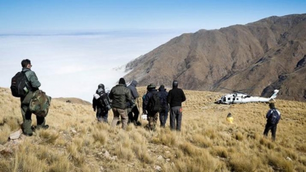 La comitiva presidencial en momentos del rescate, luego de haber pasado la noche en una zona de alta montaña de Catamarca, a raíz del aterrizaje de emergencia, por causas de malas condiciones climáticas, que debió realizar ayer el helicóptero que la transportaba desde Salta a Santiago del Estero.