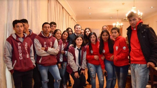 A cargo de la delegación estuvo el director de Nivel Medio, Prof. Silvio Villalba; la rectora del establecimiento del Colegio Secundario Lote 5, Prof. Yesuca Panetta, del Colegio Secundario San Gregorio; Prof. Marcela Fabiana Leiva y también acompañaron un grupo docentes de ambos colegios, quienes compartieron un momento muy ameno con el primer mandatario provincial.