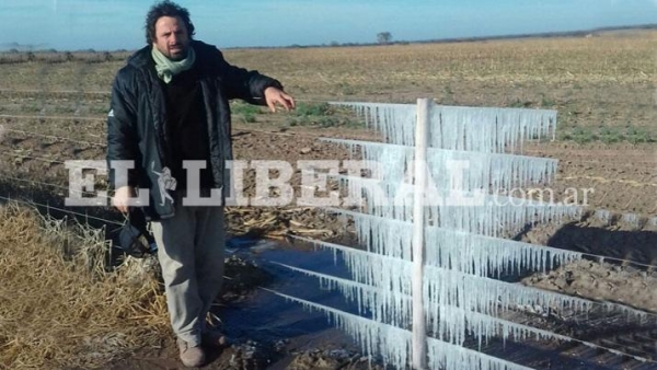En esta nota compartimos la postal del frío desde localidad de El Colorado, en el departamento Ibarra, donde se pude ver a Raúl Torres Vittar, junto a un alambrado congelado.