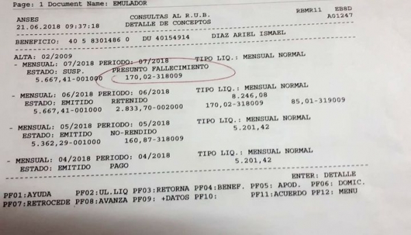 Ariel Ismael Díaz, es un joven que padece una discapacidad mental de La Merced que desde junio de este año se encuentra sin percibir su pensión no contributiva por invalidez, porque Anses y el Registro Civil lo dieron por muerto. Nadie encuentra una explicación a esta lamentable situación, calificada en el recibo de haberes como "presunto fallecimiento". Tiene 21 años y es el mayor de tres hermanos. Se encuentra al cuidado de una tía, ya que su madre falleció hace poco tiempo. Tampoco tiene padre.