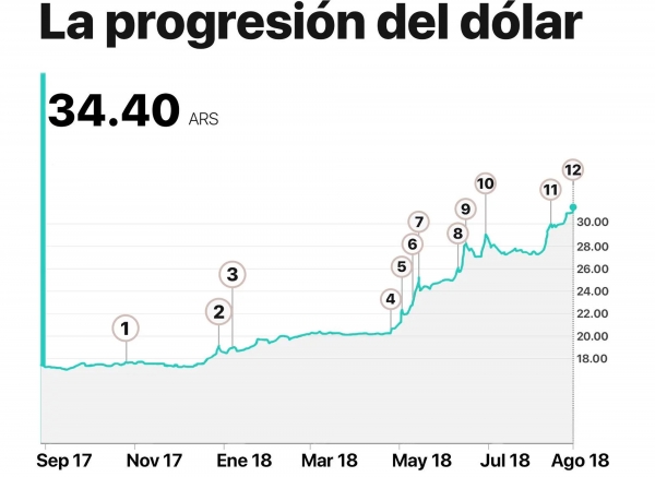 El precio del dólar aumentó prácticamente 100% en un año. El cierre del mercado cambiario del 29 de agosto de 2017 había dejado a la moneda estadounidense con un valor de $17,39. El último precio con el que terminó la jornada el miércoles, en $34,40, marca entonces un incremento total de 95%.