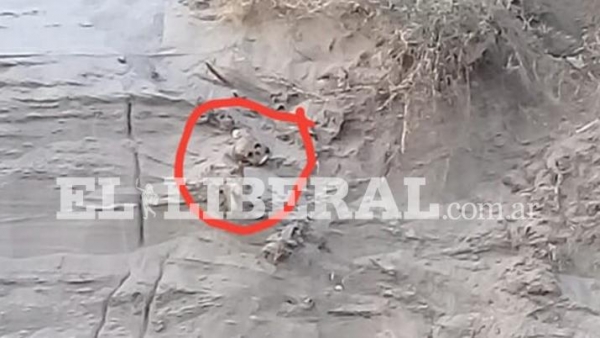 Personal Policial del Departamento de Seguridad Nº 9 investiga la sorpresiva aparición de restos óseos humanos incrustados en una barranca del río Dulce.