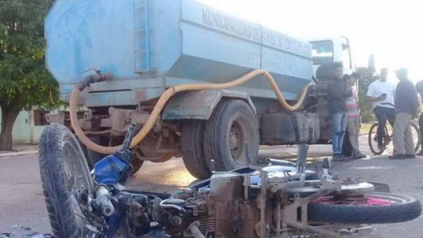 Dos jóvenes fueron trasladados a un hospital del Chaco, tras estrellarse en una motocicleta contra un camión de la Municipalidad de Pampa de los Guanacos, Copo, mientras entregaba agua en el acceso San Francisco Solano y avenida General Paz, Bº San Joaquín.