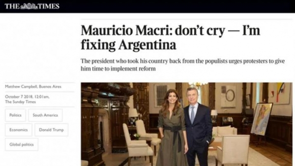 "El presidente que les arrebató el país a los populistas insta a los manifestantes a que le den tiempo para implementar la reforma". Con esta descripción fue presentado Mauricio Macri por el diario británico The Times. El mandatario brindó una entrevista al legendario medio europeo en la que abordó diversos temas de la coyuntura económica y política del país.
