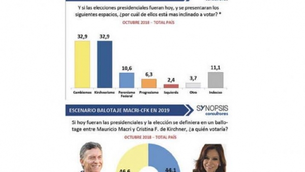 A casi un año de las elecciones presidenciales de 2019, el humor social de la gente muestra un disconformismo sobre la gestión económica de Cambiemos. Ello tiene su repercusión en las opciones electorales de la gente: de acuerdo con encuestas nacionales se consolida una polarización entre oficialismo y kirchnerismo y cada vez es más probable un escenario de balotaje entre Cambiemos y la oposición. Tomando como contendientes a Mauricio Macri y la expresidenta Cristina Kirchner, una de las mediciones, realizada por Synopsis, muestra una segunda vuelta con Macri con una intención de voto de 46,6% contra el 44,1% de CFK. Ello hablaría de un empate técnico.