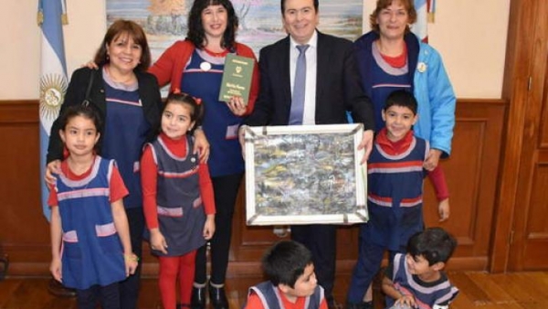 La delegación escolar estuvo encabezada por la directora del Jardín, Claudia Marota, y las docentes Fernanda Castillo y Claudia Acuña, además de los padres de los pequeños. Durante la visita de la salita de 5 años del Jardín "Grillitos", los pequeños le contaron al gobernador sobre un proyecto de la vida y obra de Don Sixto Palavecino, en el cual vienen trabajando hace un año.