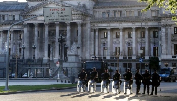 Mientras avanzaba el debate dentro de los muros del Senado, afuera cientos de militantes del kirchnerismo, de la izquierda, de movimientos sociales y de distintas vertientes sindicales protestaron frente a un Congreso vallado y fuertemente custodiado, y se registraron refriegas menores con la Policía de la Ciudad, que detuvo a dos manifestantes.