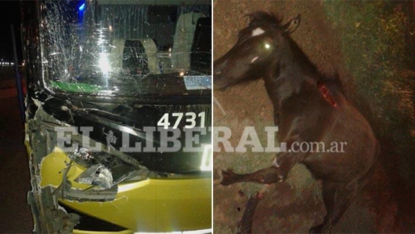 En el micro viajaban 30 pasajeros que resultaron ilesos tras el violento choque. El animal equino de color marrón oscuro, murió tras la colisión.