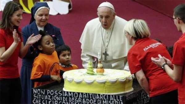 El Papa Francisco cumple este lunes 17 de diciembre 82 años y,como en años anteriores, no se prevé ninguna fiesta especial para celebrarlo sino que la jornada trascurrirá de manera rutinaria, después de que este domingo soplara las velas de una gran tarta regalo de los pequeños del dispensario «Santa Marta» del Vaticano en la que estaba escrito 'Tanti auguri', que significa feliz cumpleaños en italiano.