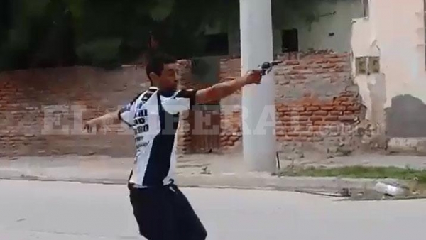 En las imágenes que se viralizaron a través de WhatsApp puede verse a un grupo lanzando piedras mientras que en el otro se destaca un individuo, con la camiseta de Central Córdoba, disparando con un revólver.