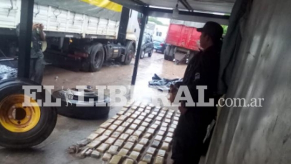En un camión que transportaba agua mineral, se encontraron 100 ladrillos de marihuana escondidos en una rueda de auxilio. Las fuerzas nacionales aun están llevando adelante el procedimiento para determinar el pesaje.