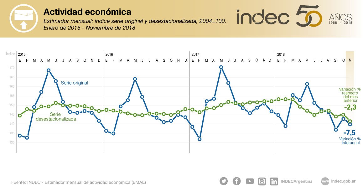 Las cifras del Estimador Mensual de Actividad (EMAE) registran que en los once meses del 2018 la producción de bienes y servicios cayó 2,2%.