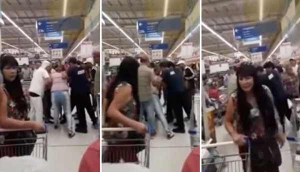 Según consta en las imágenes, las personas se avalanzaron sobre el changuito donde el repositor llevaba la oferta de milanesa de nalga a $212. Cuando se llevaron las bandejas, quedó una sola por la cual varios hombres y mujeres se trenzaron en una feroz pelea.