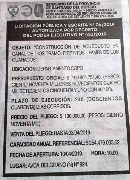 Tiempo de lectura: 30 segundosDesde nuestra gestión queremos compartir ésta alegría, hoy viernes 22 de marzo de 2019, salió publicado a través de las páginas del medio de comunicación gráfico EL LIBERAL la Licitación Pública y escrita de la obra tan Anhelada por todos nosotros: La construcción de acueducto en Canal de Dios - Tramo - Los Pirpintos a Pampa de los Guanacos