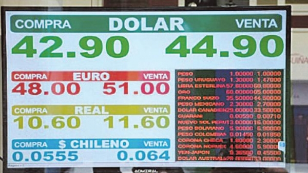 El incremento del dólar fue en sintonía con el Mercado Único y Libre de Cambios (Mulc), donde la divisa avanzó 2,9% o $ 1,23 a $ 43,87 en una rueda donde el volumen aumentó un 31% hasta los u$s 922 millones.