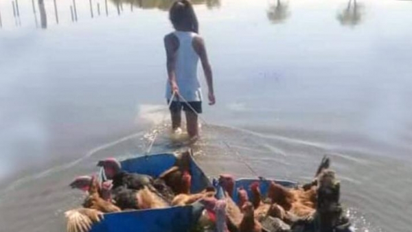 Tiempo de lectura: 53 segundosMorena fue fotografiada llevando gallinas y pavos en un "bote" improvisado con un tacho de plástico cortado al medio, atado a una cuerda.
