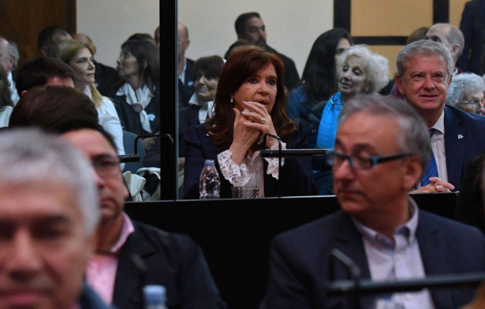 La ex presidenta Cristina Kirchner escuchó hoy las acusaciones en su contra, como presunta jefa de una asociación ilícita en el manejo de la obra pública, sentada en la última fila de la sala de audiencias, en el primer juicio oral y público a la actual senadora, por presuntos delitos de corrupción ante el Tribunal Oral Federal (TOF) 2.