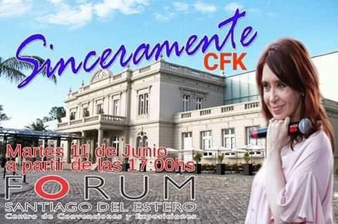Tiempo de lectura: 40 segundosEn la jornada de ayer, se confirmó la visita de Cristina Fernández de Kirchner al Fórum, para presentar su libro "Sinceramente" y hoy, el gobernador de la provincia, Dr. Gerardo Zamora, compartió en su Facebook, el flyer que promociona el evento.