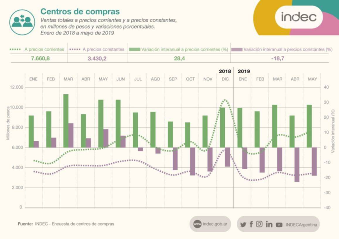 La información oficial, se completó además, con la evolución de las ventas en los shoppings. Estas alcanzaron un total de $3.430,2 millones, lo que representa un aumento de 5,5% respecto al mes anterior y una disminución de 18,7% a nivel interanual.