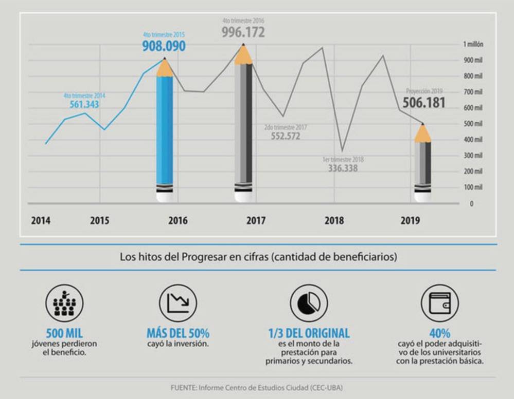 Tiempo de lectura: 5 minutos, 56 segundosEl Progresar, que se había ideado como una ayuda económica destinada a jóvenes de entre 18 y 24 años de bajos recursos para que terminen la escuela primaria, secundaria e inicien o continúen sus estudios superiores ha sufrido un proceso de desmantelamiento durante los últimos 3 años. Hoy se invierte menos de la mitad de lo que se invertía en 2015.