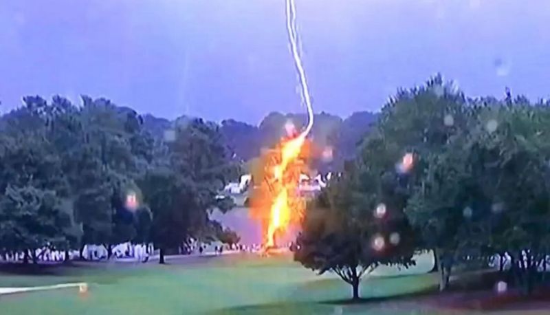 La tercera ronda del último torneo de la temporada del PGA Tour se había suspendido unos 30 minutos por las tormentas en la zona. Se había pedido a los espectadores que buscaran refugio. El rayo cayó en la parte alta del árbol, justo frente al hoyo 16, y despidió fragmentos de la corteza.