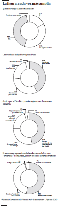 A dos semanas de las PASO y cuando todos los frentes reacomodan sus estructuras para enfrentar la campaña de cara a las elecciones de octubre, los argentinos en mayoría creen que hay problemas de fondo que las urnas no resolvieron y hasta profundizaron. Más de la mitad piensa que en el país está en riesgo la gobernabilidad, que las medidas del Gobierno para aliviar la crisis no sirven o sirven poco; que el macrismo difícilmente mejore su performance y llegue al balotaje. Mientras, un triunfo del Frente de Todos divide las opiniones casi por la mitad respecto de quién tendrá el mando si Alberto Fernández o Cristina Kirchner.