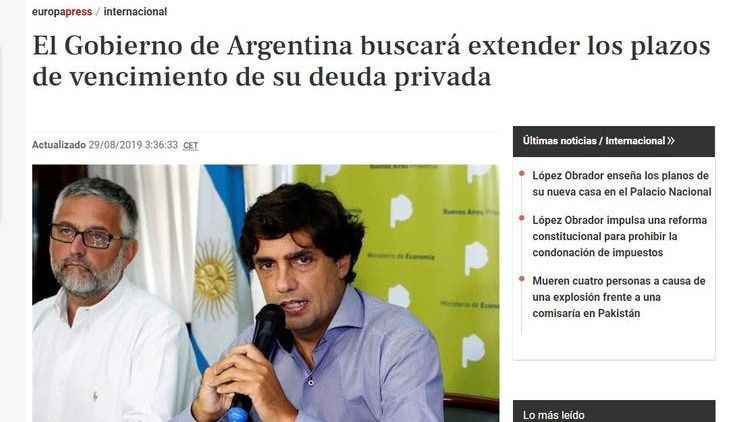 Tiempo de lectura: 1 minuto, 16 segundosTras los anuncios de este miércoles del ministro de Hacienda, Hernán Lacunza, sobre un "reperfilamiento" de la deuda de corto plazo y un proceso de canjes voluntarios, los medios periodísticos del mundo se hicieron eco de la noticia argentina y analizaron el escenario económico del país.