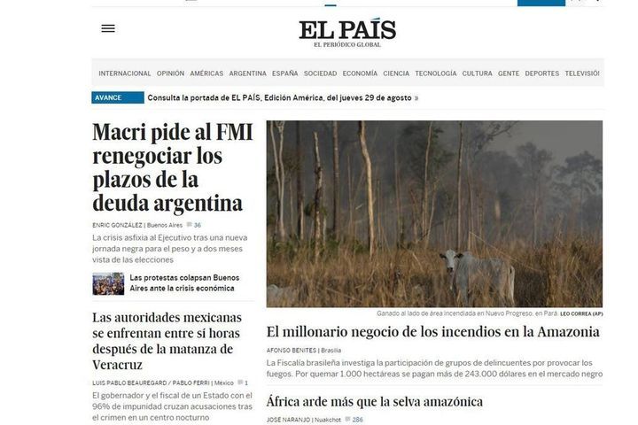 También El País de España dio un amplio espacio a la noticia argentina."Macri pide al FMI renegociar los plazos de la deuda argentina", tituló el diario español. En el cuerpo de la nota se dan detalles de la crisis que enfrenta el gobierno de Mauricio Macri y describe que ayer fue una "jornada negra para el peso".