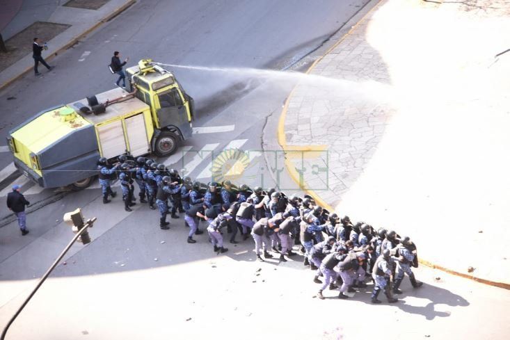 En la imagen capturada por NORTE se observa un fuerte cordón policial que repele a los manifestantes con balas de goma, la utilización del camión hidrante y la policía montada. Como consecuencia del hecho, hubo al menos cinco efectivos policiales lesionados.