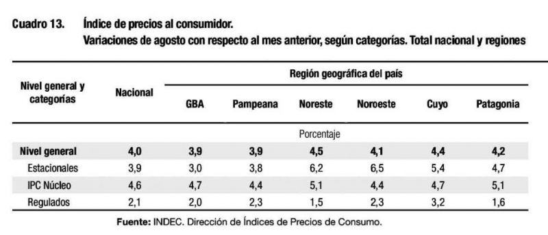 Para una familia tipo de tres miembros el costo de la CBT fue en agosto de 26.282,37 pesos y la alimentaria de 10.555,17 pesos, mientras que para un hogar compuesto por cinco integrantes la CBT costó en el mismo mes 34.722,64 pesos y la alimentaria 13.994,84 pesos.