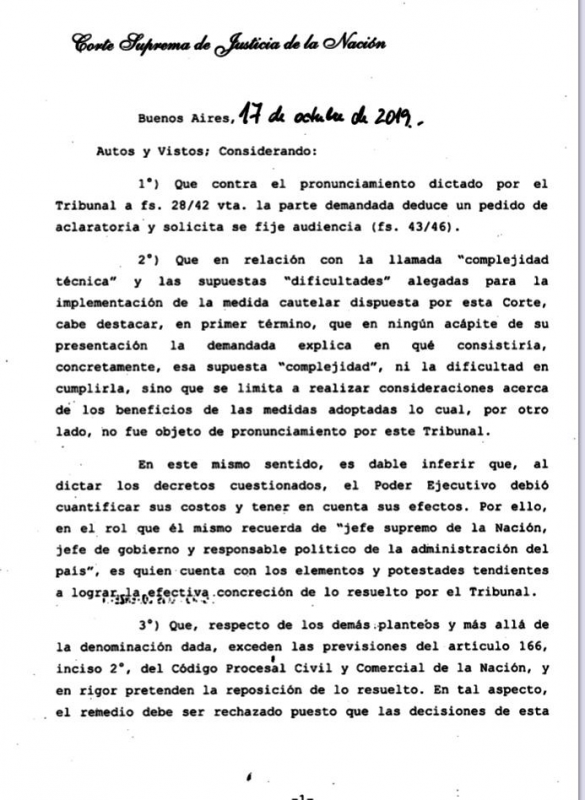 La decisión de la Corte, refrendada por los ministros Carlos Maqueda, Ricardo Lorenzetti y Horacio Rosatti, aclaró que la presentación del Estado Nacional no explicó cuáles eran la “complejidad técnica” y las supuestas “dificultades” para cumplir con las medidas, con lo cual entendió que no hay nada para aclarar.