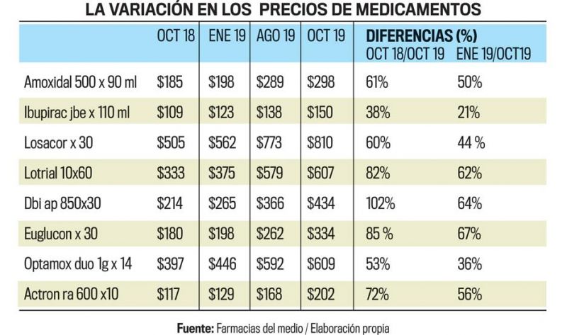 El alza que registraron los precios de un grupo de medicamentos recetados para las afecciones más comunes de salud en las farmacias santiagueñas, alcanzó un promedio del 70% interanual este mes comparado con octubre de 2018 mientras que en el acumulado de este año, el avance de los precios fue de un 50%.