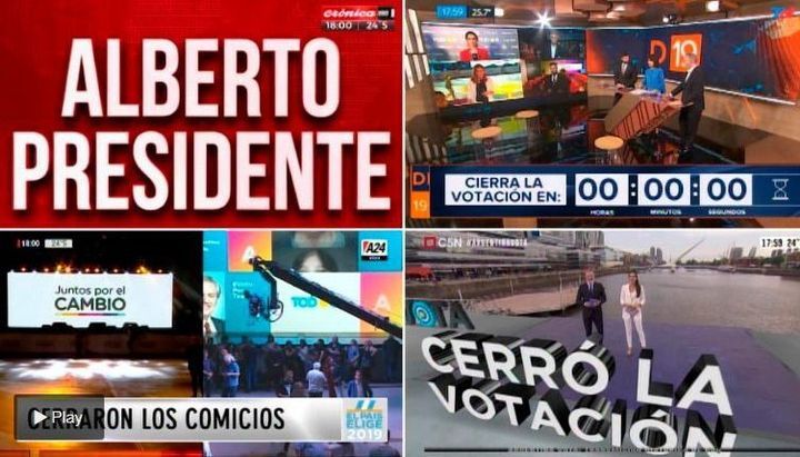El primero en brindar resultados del escrutinio fue Crónica TV. Para no romper la veda, ya venía anticipando con un graph “Argentinos 52 - Boca 34”, en referencia, por supuesto, a Alberto Fernández y Mauricio Macri. Y unos segundos antes de las 18 lanzaron su clásica placa roja con solo dos palabras: “Alberto presidente”.