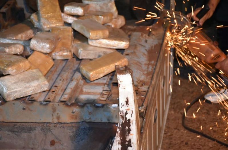 Los funcionarios, con el uso de amoladoras, hallaron un doble fondo en el sector señalado por el can. En ese compartimiento hallaron 85 paquetes rectangulares envueltos en cinta.