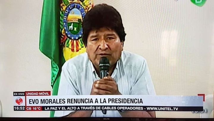 Evo Morales anunció esta tarde, desde Cochabamba, su renuncia a la presidencia de Bolivia. Lo hizo en un mensaje que se transmitió por diversos medios y con un desenlace que llega tras la consumación de un golpe impulsado por la oposición de derecha y la Policía, a las que luego se sumó el espaldarazo de las Fuerzas Armadas que ayer habían asegurado no iban a participar en el conflicto interno y hoy " sugirieron" la renuncia del mandatario boliviano.