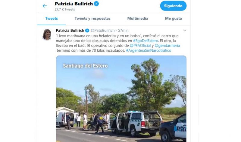 La ministra de Seguridad de la Nación, Patricia Bullrich, subió un video a las redes sociales, a modo de resaltar el trabajo conjunto de las fuerzas de seguridad que dependen de su cartera, en el hallazgo y secuestro de 86 ladrillos de marihuana en Santiago del Estero.