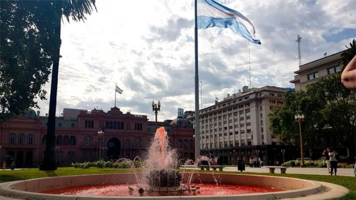 Los organizadores de la marcha que se va a realizar hoy para conmemorar los cinco años de la muerte de Alberto Nisman tiñeron el agua de dos fuentes de la Plaza de Mayo de rojo sangre para homenajear al fiscal. La iniciativa se concretó esta mañana muy temprano a pesar de la gran presencia policial en el lugar.