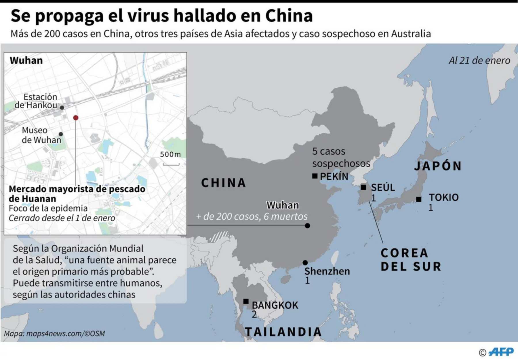 Más de un mes después de su aparición en un mercado de la ciudad de Wuhan (centro), se reportaron casos con el virus en otros tres países asiáticos: Japón, Corea del Sur y Tailandia.